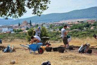 We are inching toward the end of the second week. Things are falling into routine. One common feature of this excavation, like many, is people arriving and departing. Within the past week, we have seen the arrival of Tina Ross, our illustrator, Bartek Lis, one of our ceramicists, Camilla MacKay, our database and Medieval ceramicist, Nepheli Theotokou and Vicky Karas, our conservators, and tomorrow, Trevor Van Damme, our other ceramicist. And today we say good-bye to Janet Jones, from Bucknell. Nick Blackwell and Kyle Jazwa returned to Athens after short visits.Yin Lam departed last week too. It’s a lot to keep track of but everyone seems to fully understand that this undertaking is a massive team effort and everyone’s contribution matters greatly. On site, digging everyday, we are fairly consistent with our supervisors and students/volunteers – these don’t change too much. We are a very big work crew – the biggest we’ve ever fielded at EBAP and the amount of earth we are moving demonstrates this. The weather has also finally turned full-on SUMMER. Yesterday probably hit 35 degrees in some parts of the site. And unfortunately, the lower we dig, the hotter it is out of the breeze. We (Joe last year, with Spencer this year) have built sun shades made of aluminum pipes and green netting used for olive collection. These are coming in very handy. Teams will lift the four corners and rotate them during the course of the day as the sun moves, giving vital shade to the diggers and shovelers below. The wheelbarrowers, unfortunately, don’t get much shade.