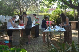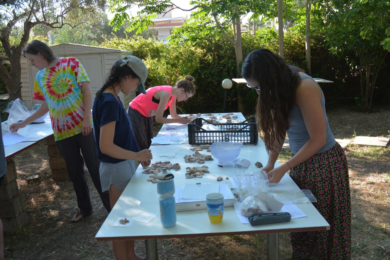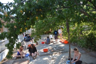 Here are some photos showing what goes on in the second half of our day, starting at 5 pm until 7 Monday to Friday.After returning from site we observe a typical Greek town rest-period, quiet hours. Some of us sleep, some swim, others read and rest. A few sneak in a bit more time working or catching up with work back home. At 5 our house comes to life. Students begin by collecting the dried pottery from the screens from the day before. These are bagged with their numerical tags inside and outside and put in bins for the supervisors to sort, assisted by students at the white tables. The sherds are sorted by weight and type. Diagnostic pieces are separated out for further detailed study and photography. Other students start washing the daily sherds we’ve brought home from the field that day. On a hot a day, it can be somewhat cool and refreshing to be gently cleaning dirt off the ceramic fragments in plain water using small brushes. We have a beautiful apricot tree providing shade and the sweetest apricots for snacking.