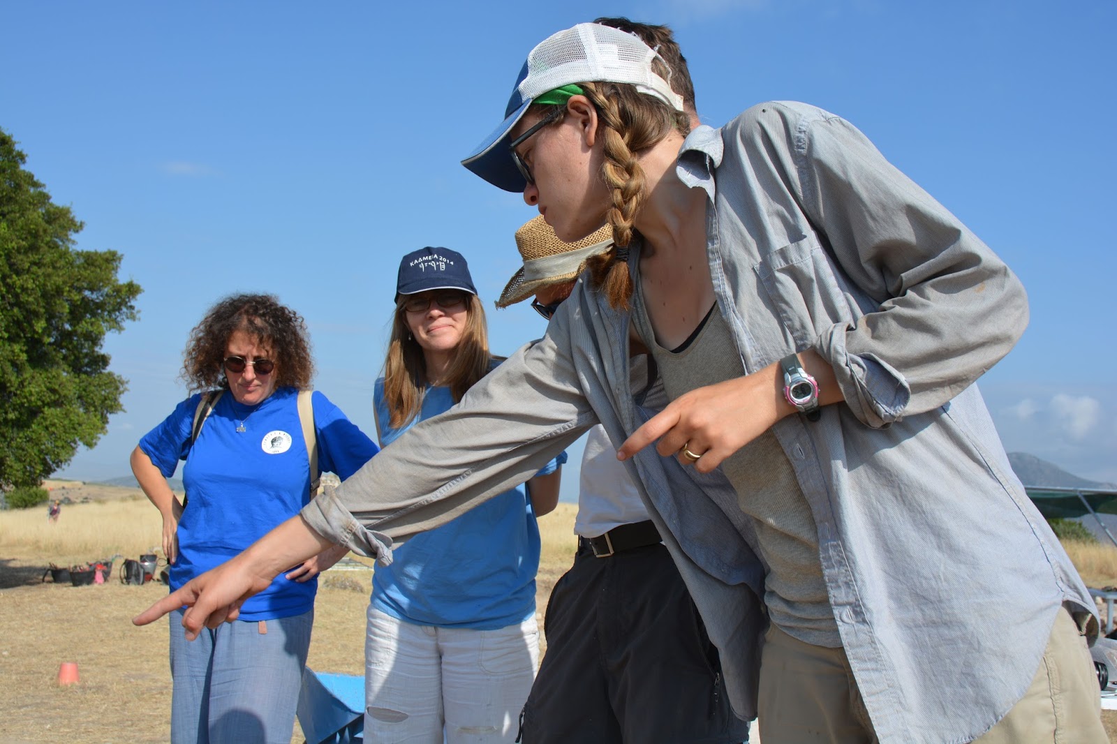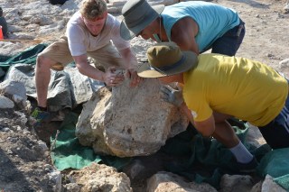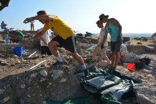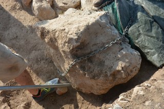We have reached the midway point of our excavation. Last week ended with a slightly shorter Saturday than normal because of a downpour. This resulted in a very chilly lunch at Stavroula’s. The family kindly brought out every piece of clothing they had to keep everyone warm. Before the rain we were able to get a good amount accomplished – including the removal of a very large stone (photos below)