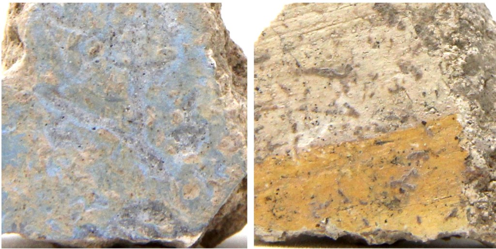 At the site of ancient Eleon, two pieces of painted plaster that may be fresco remnants were found in the Northwest Sector (Figure 2). Both fragments are small: one preserves monochrome blue decoration with possible overpainting in black while the other is white and yellow. Based on mendable pottery found in the same stratigraphy, the fragments all appear to date to LH IIIB1. The stratigraphy suggests that they may have been part of a fill consisting of levelled destruction debris.